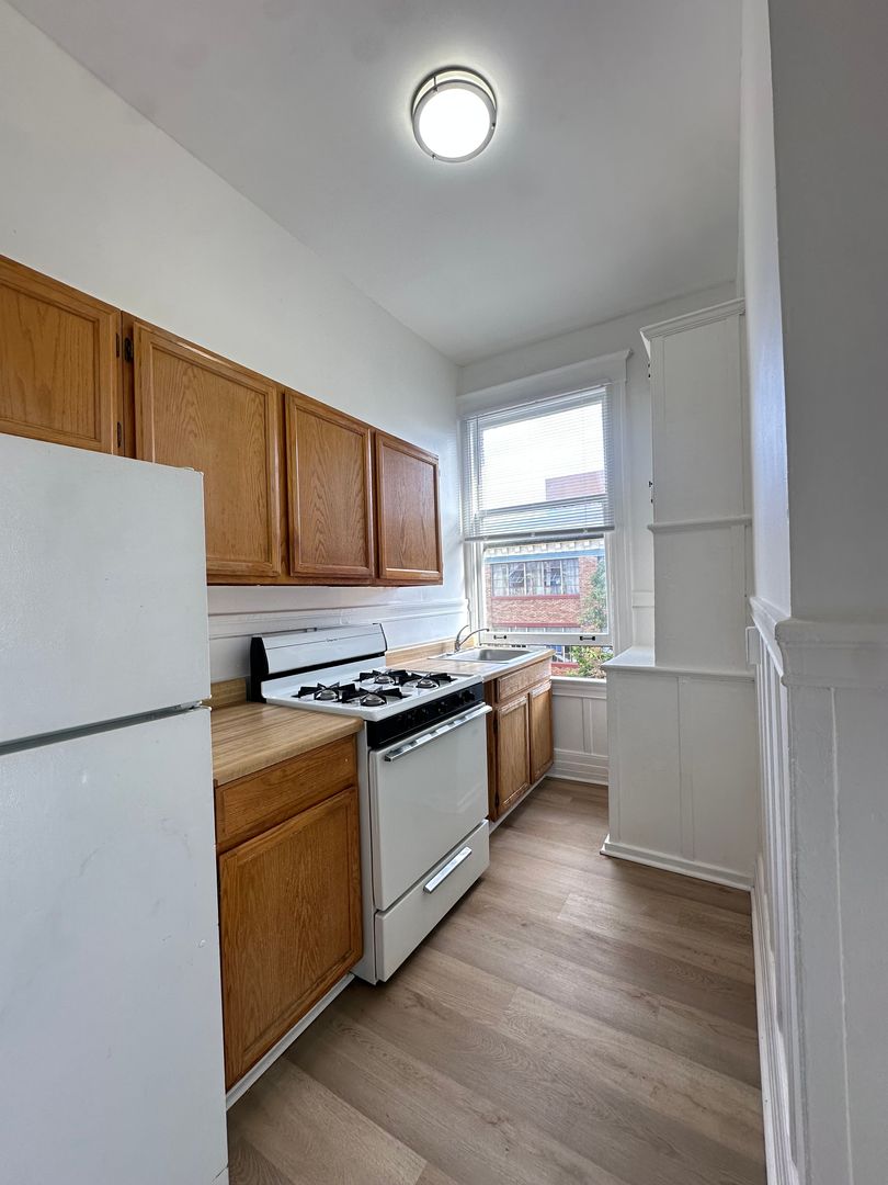 • Eat-in kitchen w/ gas stove & fridge