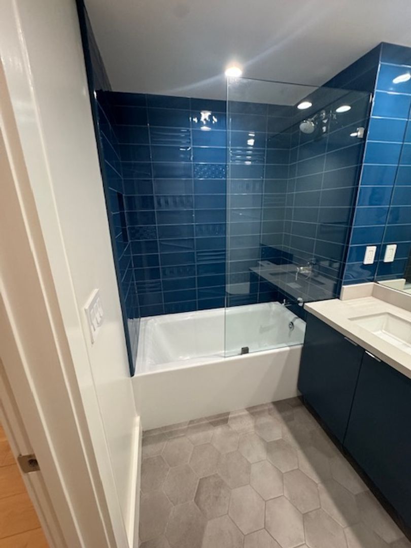 • Bathroom with beautiful tiles surrounding the tub and vanity