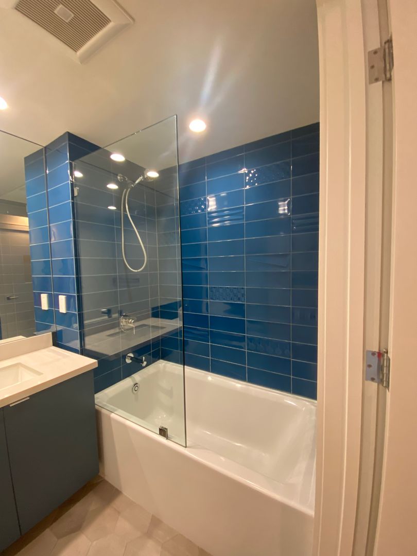 • Bathroom with beautiful tiles surrounding the tub and vanity