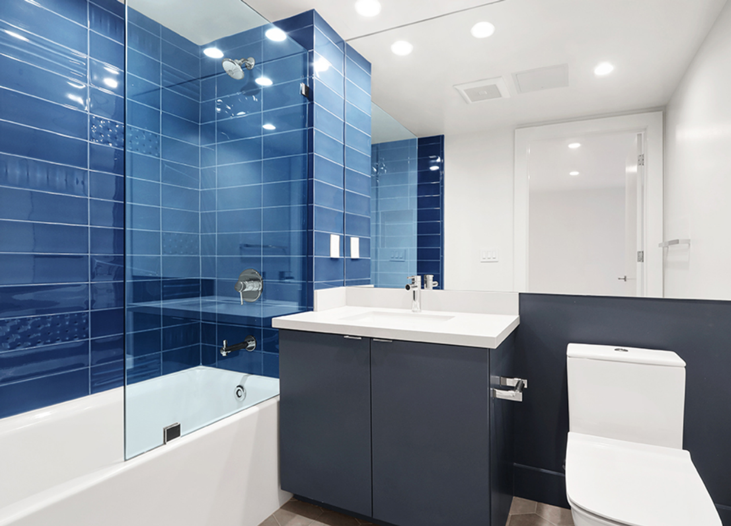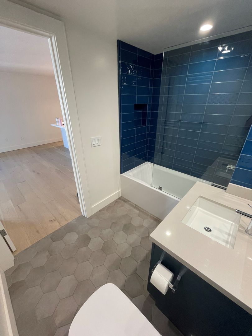 • Bathroom with beautiful tiles surrounding the tub and vanity