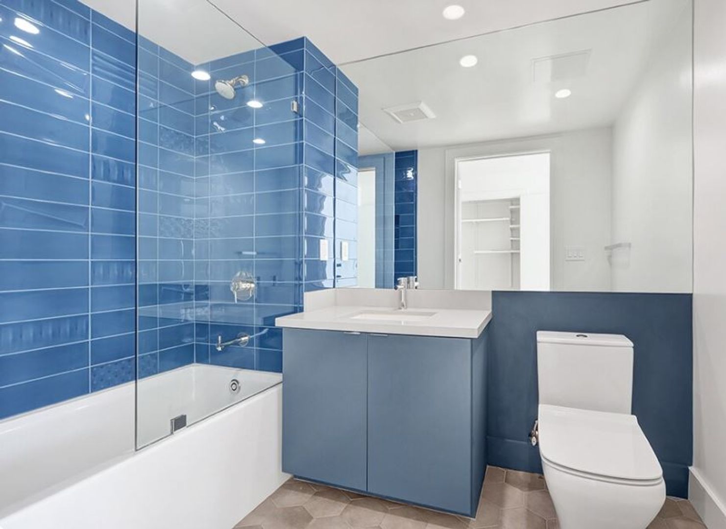 • Bathroom with beautiful tiles surrounding the tub and vanity