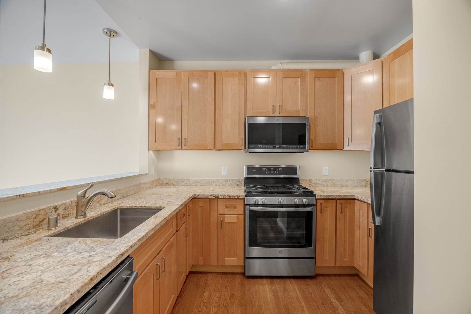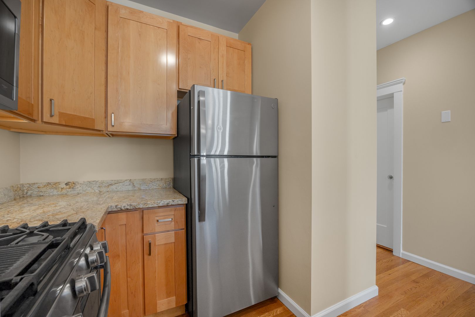 • Kitchen w/ gas stove, fridge, and quartz countertops